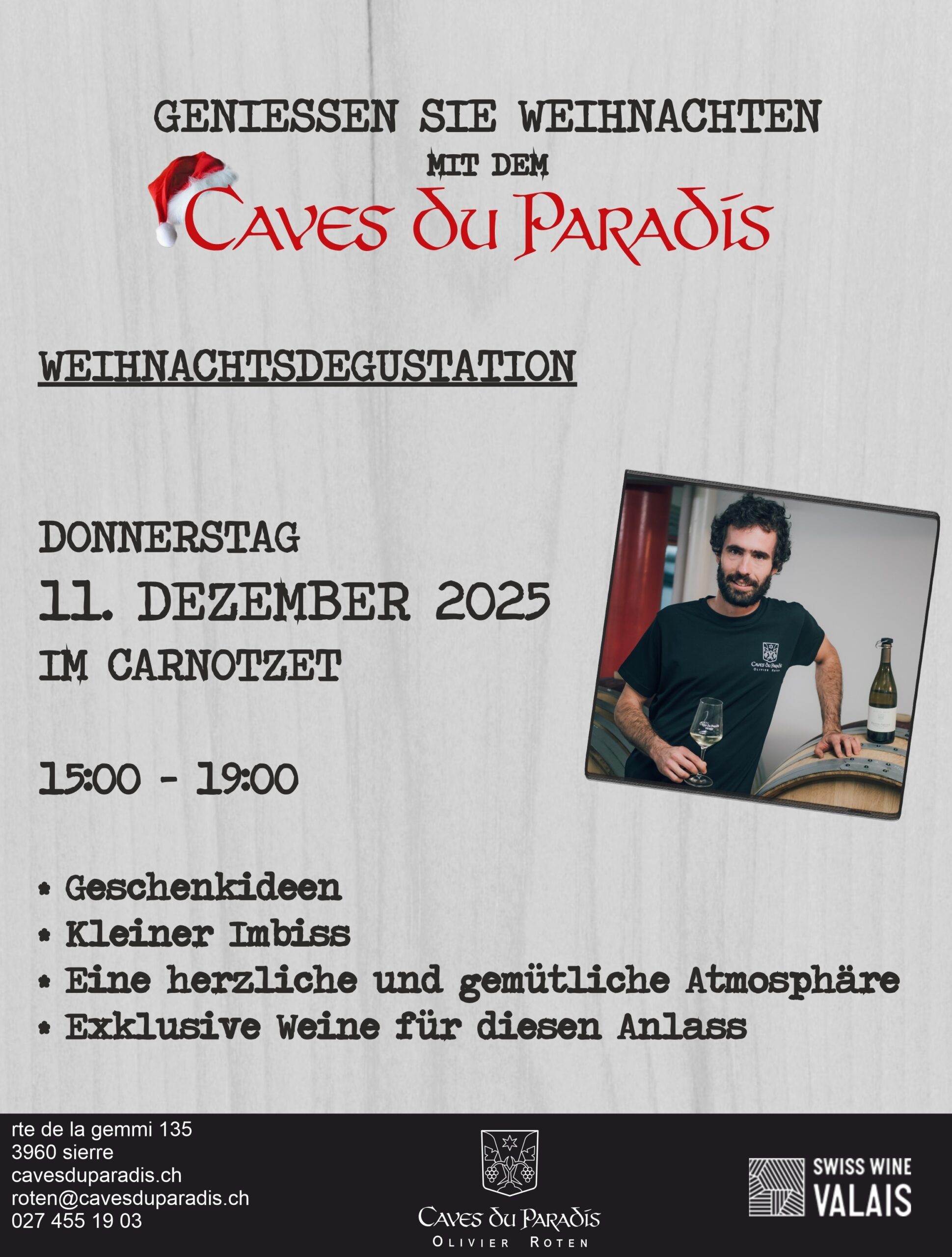 Sie sind herzlich eingeladen unseren Keller während dieser Zeit zu besuchen, um die feinen Weine vom Caves du Paradis zu entdecken.